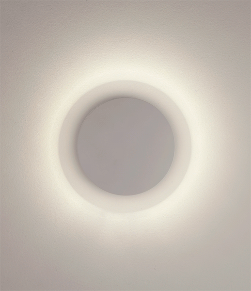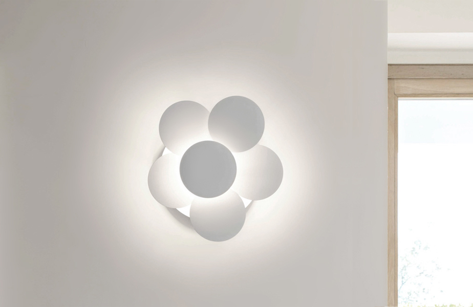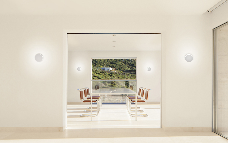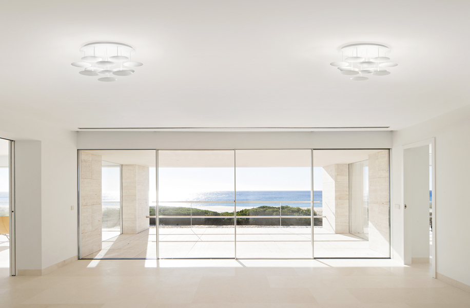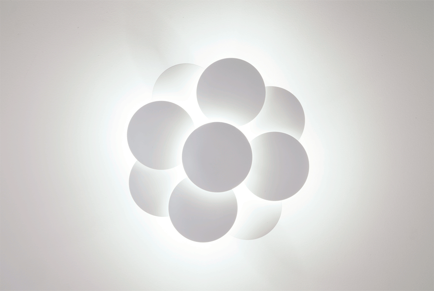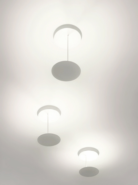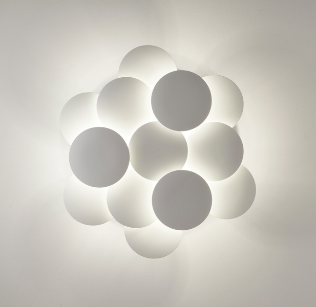 The lamp illuminates the space by reflecting light from one disc to another, creating multiple shadows. The wram LED light sources are hidden in the upper part of each circle, tricking the observer with regards to the source of the light. CIRCLES comes in various models and sizes: Wall light, Ceiling lamp or Single fittings. It is composed of 160 mm diameter aluminium discs linked to the main piece with variable length tubes.