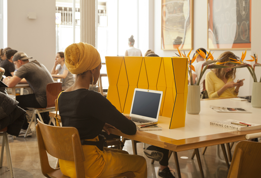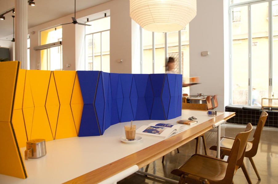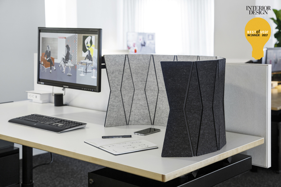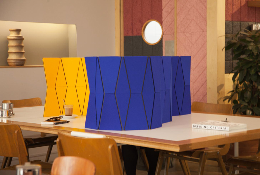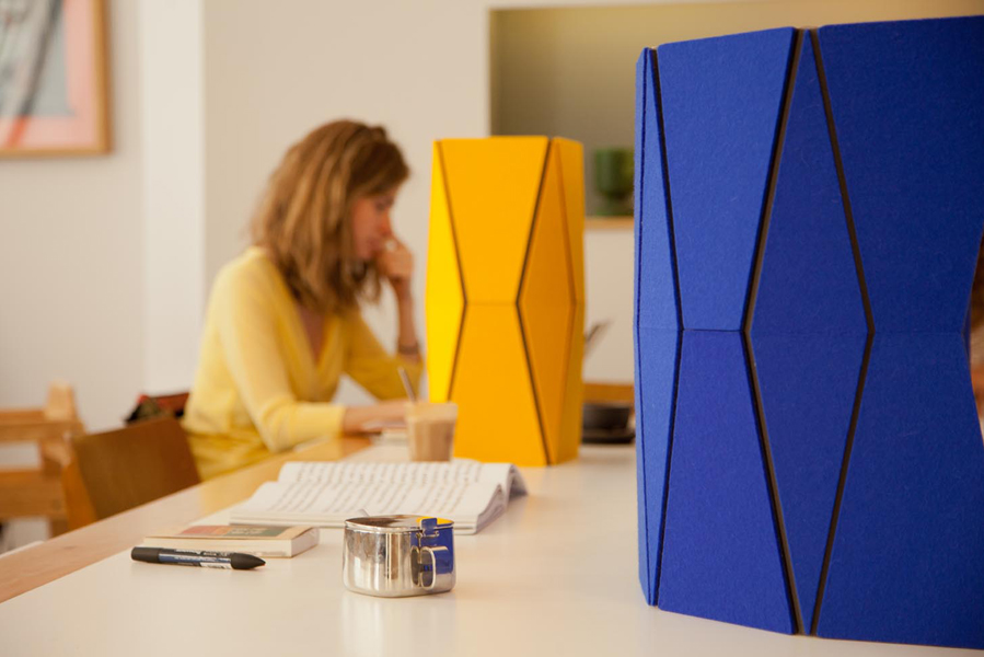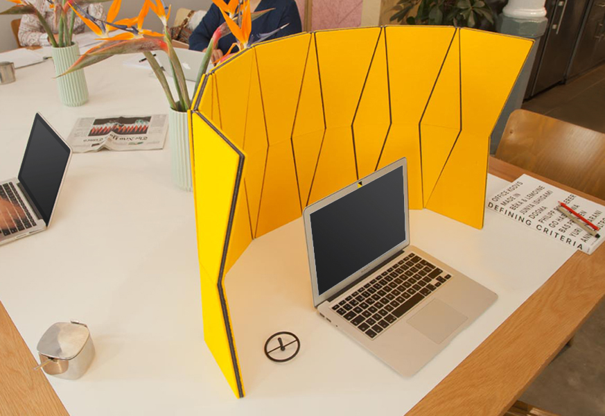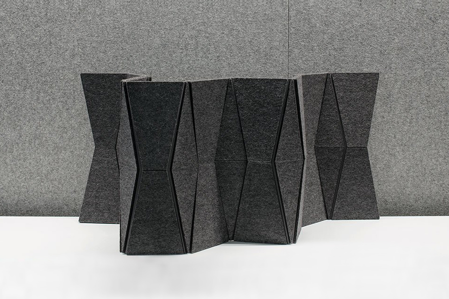 JUST FOLD IT is a reconfigurable and portable desktop screen with acoustic absorption properties. This partitioning system works perfect in shared spaces where extra privacy and acoustic comfort is required. The faceted screen has individual panels of 100% wool felt mounted to a durable stay material and uses integral and flexible nylon hinges to allow reconfiguration by simply shifting sections of the screen. The JUST FOLD IT can lay completely flat for efficient storage and transport or roll up to be taken along.