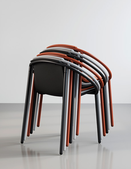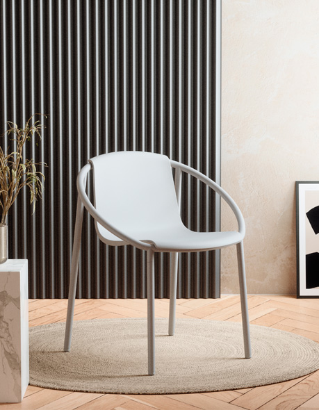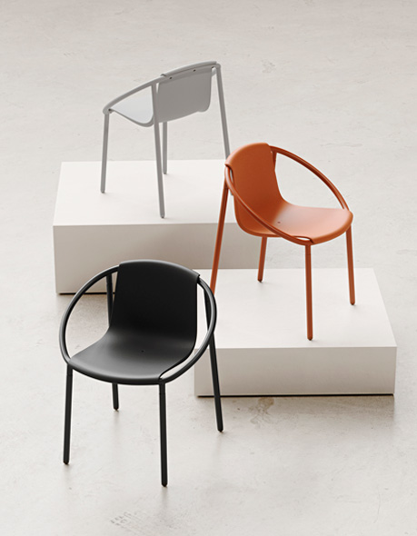 The empty space created on the lower back of the seat creates an effect of surprise, makes the chair stackable and confers a unique character and personality to the design.