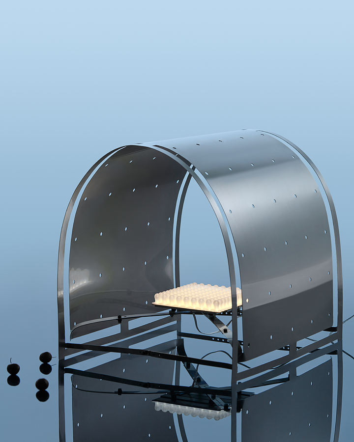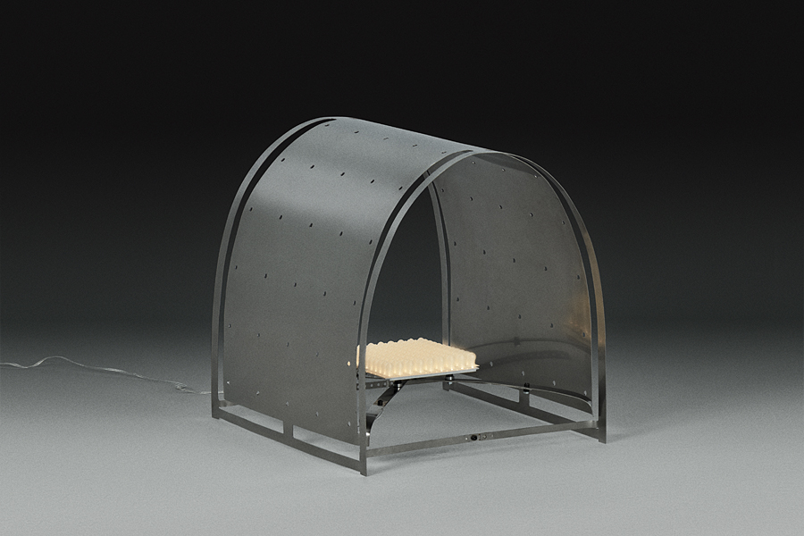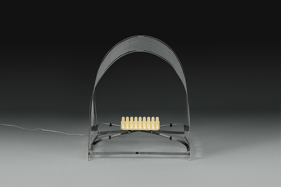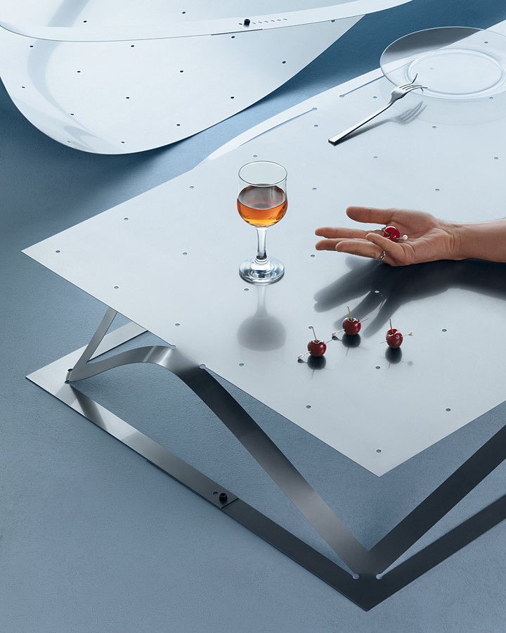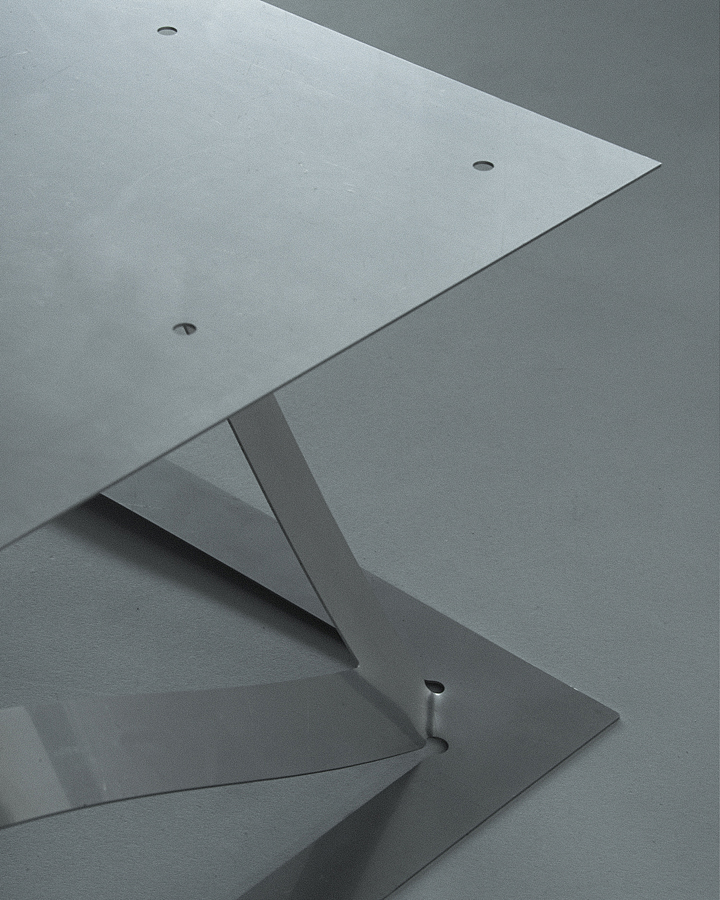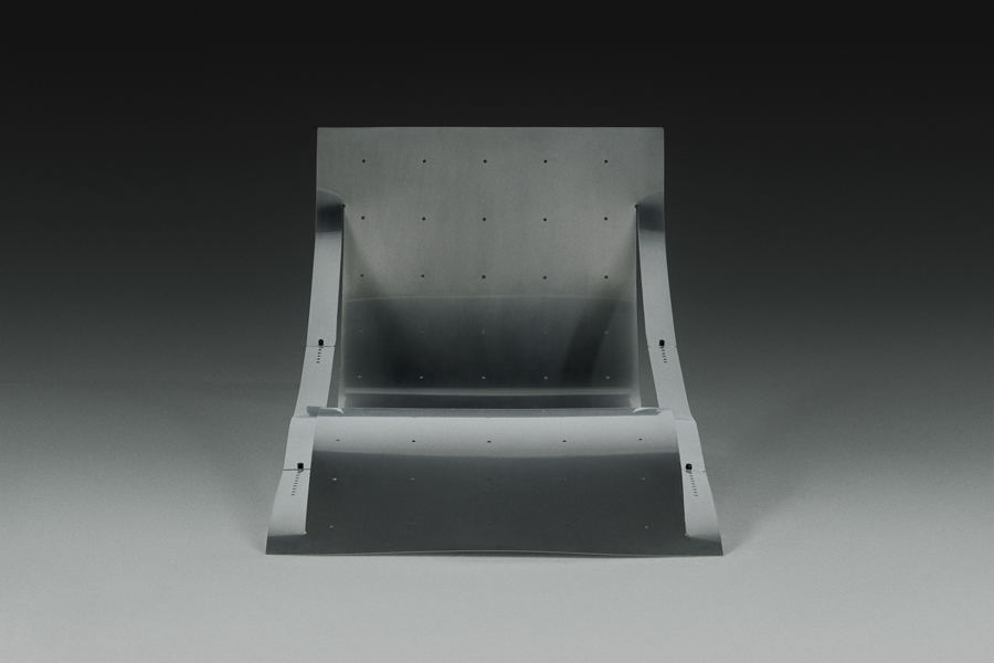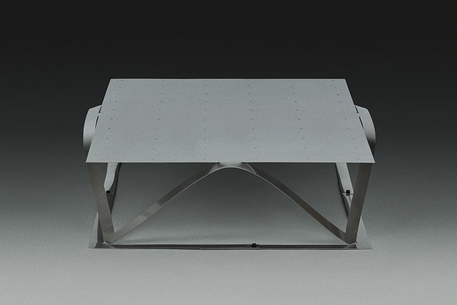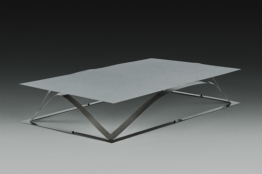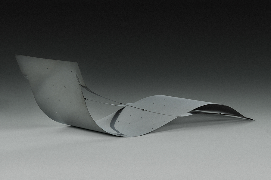 Planar laser-cuts render 2D sheets of metal into 3D tensioned and transformed functional typologies: a chaise longue, a low table, and a floor lamp. The sculptural designs are adaptable, owing entirely to the innate material properties they harness and accentuate.