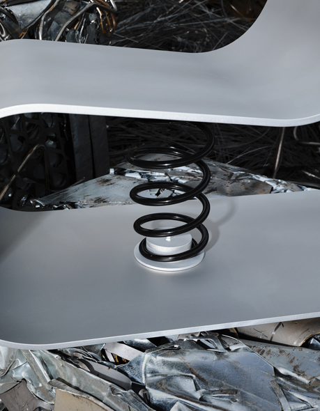 A repurposed car spring is used to control the swing of the seat, giving it a unique character and making it surprisingly comfortable to sit.